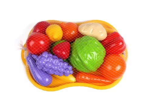 Яскравий іграшковий набір продуктів. У комплекті: піднос (31,5 х 22,5 см), перець, помідор, яблуко, апельсин, морква, цибуля, лимон, банан, кукурудза, картопля, грушка, огірок, капуста, баклажан і виноград.