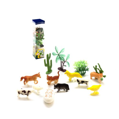 Набір складається з 12 пластикових фігурок в колбі з кришечкою у вигляді тварини. У колбі по 10 тварин, 4 дерева і яйце динозавра. Приблизний розмір фігурки – 3-6 см.