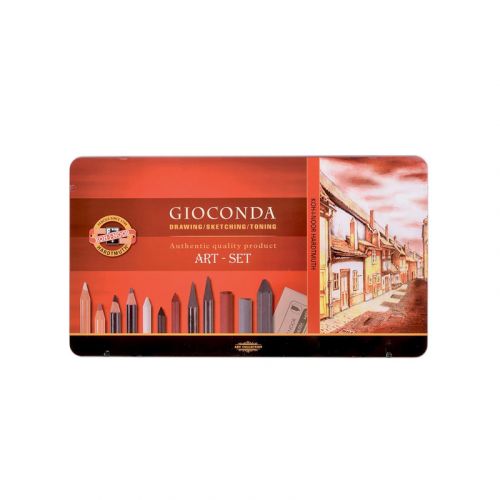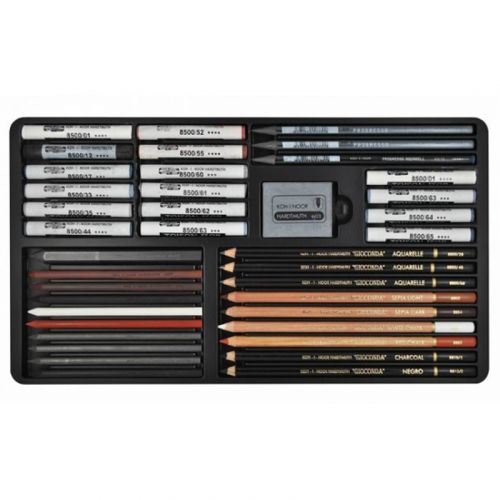 Художній набір у подарунковій металевій упаковці. 39 предметів: – 16 пастельних крейд; – 9 грифелів (графіт, біла крейда, вугілля, сангіна); – 3 акварельних олівця чорних (2В, 4В, 6В); – 1 графітний акварельний олівець; – 2 графітний олівця (6В, 8В); – 6 художніх олівців; – 1 гумка для художніх робіт.