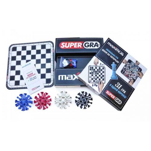 Комплектація: Поле для гри в класичні шашки та шахи, поле для гри в шашки та шахи на чотирьох, 4 комплекти шашок – 48 штук, 4 комплекти шахів – 64 штуки, інструкція для 31 гри