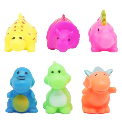 Набір складається з 6 яскравих гумових іграшок-пищалок у вигляді різних динозаврів. Виготовлені з якісних та безпечних матеріалів. Сприяють розвитку у малюка навичок дрібної моторики, сприйняття кольорів і уяви. Чудово підійдуть для гри у ванні. Розмір однієї іграшки: приблизно 6х7 см.