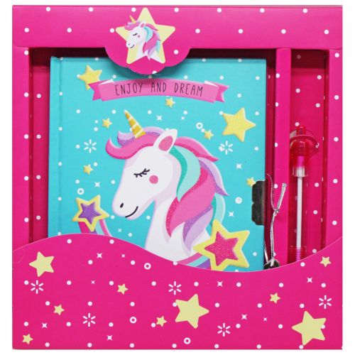 Симпатичний подарунковий набір з яскравим блокнотом на замочці та ручкою. Обкладинка блокнота прикрашена яскравим малюнком із блискітками, обовʼязково приверне увагу дитини. Закривається на замочок, у комплекті є два ключики. 56 аркушів у лінію. Розмір блокноту 21 х 19.5 см.