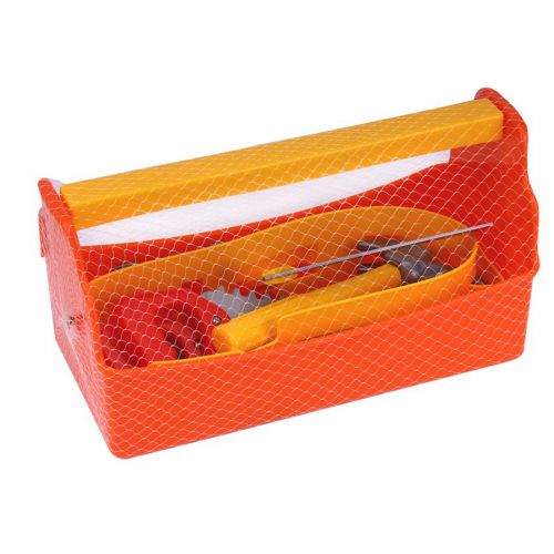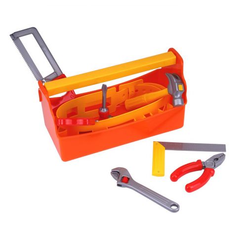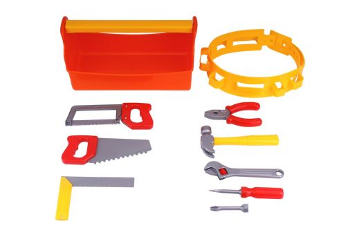 Набір інструментів у коробці. Складається з органайзера, плоскогубців, кутника, молотка, пилки по дереву, пилки по металу, розвідного ключа, 2 насадок для викрутки, ручки викрутки, пояса, коробки. Все зроблено із високоякісного пластику. З набором можна весело грати в інженерів-електриків. Виглядає дуже яскраво та кольорово.
