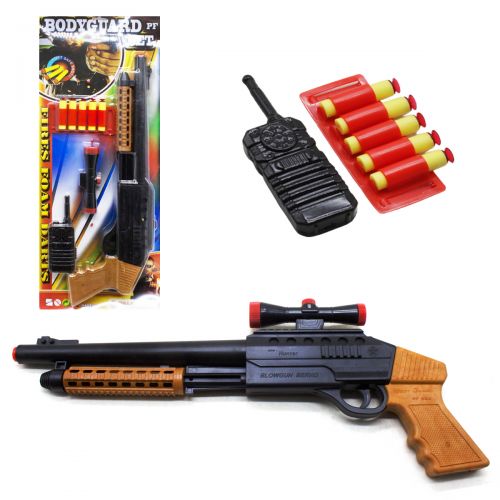 У набір входить: дробовик, який стріляє м’якими снарядами, 5 патронів на присосках, приціл, рація.