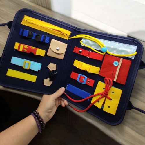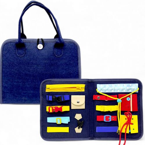 Навчальна бізісумка з фетру “Застібки” — це розвиваюча іграшка, що сприяє розвитку дрібної моторики та координації рухів у дітей. Усередині сумки розташовані різноманітні застібки: блискавка, гудзики, кнопки, ремінець, липучки, фастакс. Кожен елемент надає можливість дитині тренуватися в застібанні та розстібанні, що допомагає розвивати логіку та самостійність.
