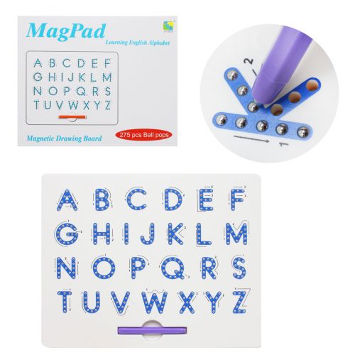 Навчальна дощечка “Алфавіт”. Являє собою пластикову дощечку із зображенням букв англійського алфавіту. На кожній букві ямочки, всередині яких розміщені металеві кульки. У комплекті є ручка-стилус з магнітом. Якщо провести стилусом по буквах, кульки з луночек будуть підніматися і зафіксуються на поверхні. Розмір дощечки – 31х25 см. Виконано з якісного пластику.