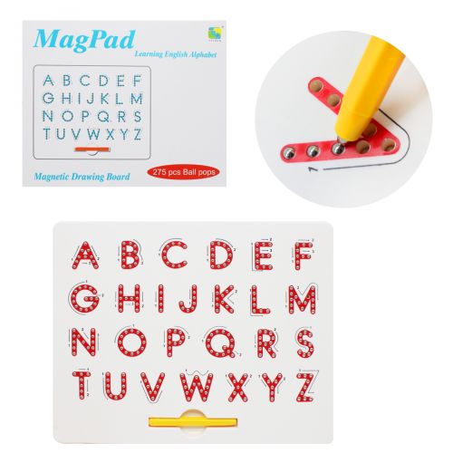Навчальна дощечка “Алфавіт”. Являє собою пластикову дощечку із зображенням букв англійського алфавіту. На кожній букві ямочки, всередині яких розміщені металеві кульки. У комплекті є ручка-стилус з магнітом. Якщо провести стилусом по буквах, кульки з луночек будуть підніматися і зафіксуються на поверхні. Розмір дощечки – 31х25 см. Виконано з якісного пластику.