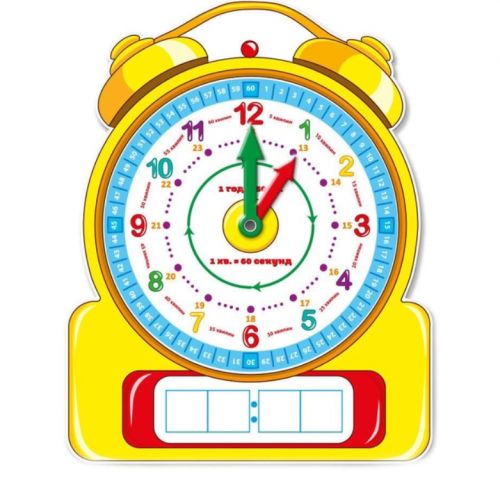 Навчальні картонні годинник зі стрілками. Допомагають дитині навчитися розбиратися в часі за допомогою цифр і назв, які написані на циферблаті, і двох стрілок. З заднього боку є інструкція, де детально розписані кроки, як допомогти дитині навчитися користуватися справжніми годинами.