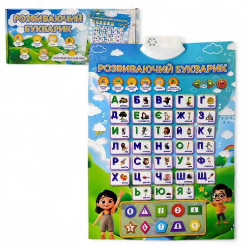 Цей інтерактивний навчальний плакат надзвичайно простий у використанні. Він навчить вашу дитину всьому: літерам, формам і цифрам. Він також має різні інші режими, орієнтовані на декламування віршів, розвʼязування простих математичних рівнянь і відгадування загадок. Цей плакат є одночасно розважальним і навчальним!
