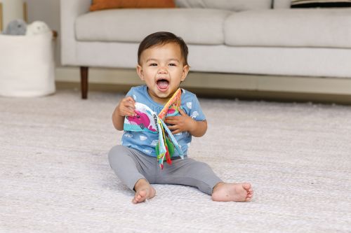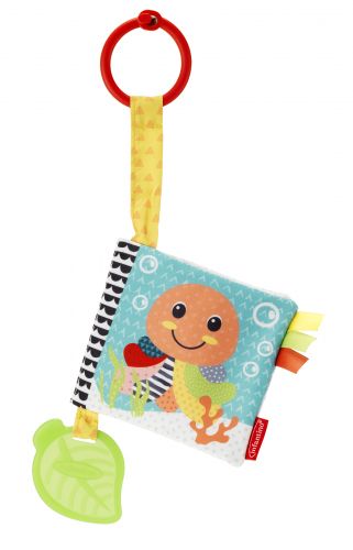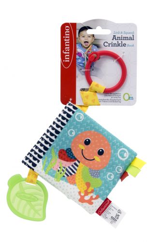 Ця чарівна книжка з тканинної матерії має сторінки, що шарудять, а також пищалку та прорізувач для зубів, який можна гризти. Доброзичливі, милі малюнки тварин викличуть у малюка посмішку та забезпечать зорову стимуляцію. Звуки шарудіня та пищалка заохочують до сенсорних відкриттів та досліджень. Дуже практична та зручна для подорожей, вона оснащена пластиковим кільцем, яке дозволяє батькам прикріпити її будь-де, наприклад, до стільчиків для годування, колясок та ліжок.