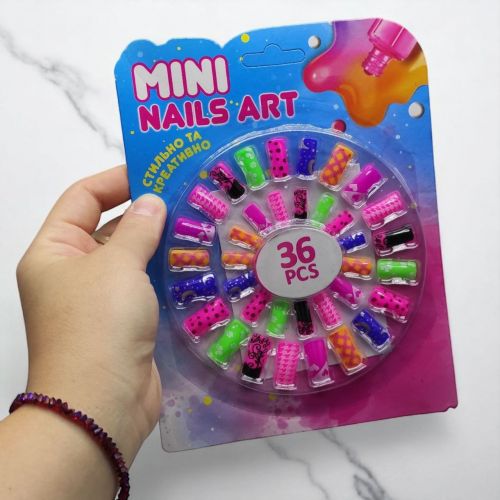 Набір складається з 36-ти шт. накладних нігтів різних кольорів і з різними візерунками. Кожен ніготь має клейку основу, щоб їх прикріпити потрібно зняти захисну плівку. Довжина: 2 см.