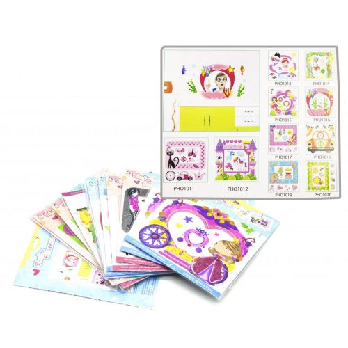 Наклейка у вигляді фоторамки дозволяє зробити фоторамку своїми руками. Для цього, фото поміщається на картон, а поверх нього клеїться наклейка рамка. У комплекті з рамкою, так само, є стікери. Розраховані на фото розміром, приблизно, 15х20 см. У наборі є різні види рамок (12 штук).