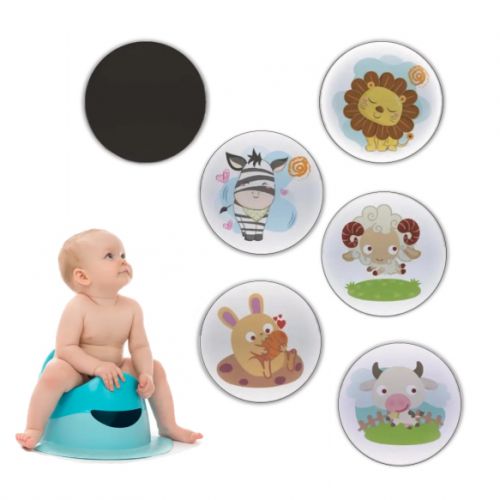 Наліпки для привчання дитини до горщика допоможуть швидко та легко здобути здобути нову навичку. Як це працює: зображення тваринки проявляється, коли на наклейку потрапляє тепла рідина. Після висихання наліпка знову темніє. Спосіб застосування: приклейте наліпку на суху знежирену поверхню; покажіть дитині, як при контакті з теплою водою зʼявиться яскравий персонаЖ; промийте наліпку холодною водою і малюнок зникне.Термін використання: 8+ тижнів. Розмір наліпки – 7 см. Матеріал: термовініл. У комплекті є 5 наліпок.
