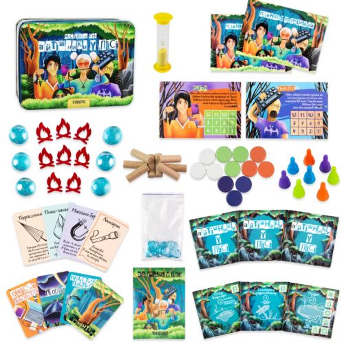 Комплектація: Гральні картки – 99 шт., поля – 25 шт., планшетки персонажів – 4 шт., фішки – 8 шт., жетони – 40 шт., фігурка вогнища – 8 шт., фігурка води -14 шт., дрова – 8 шт., пісковий годинник – 1 шт., інструкція.