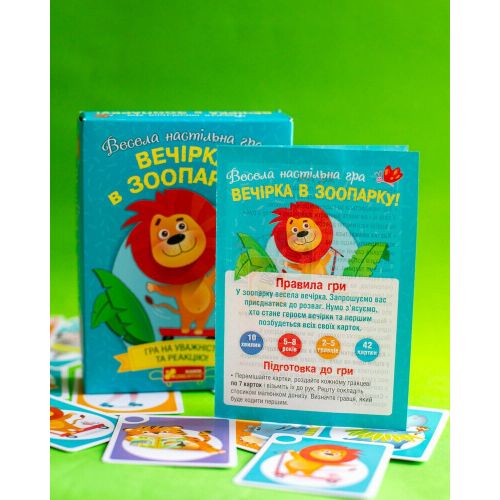 Весела настільна гра «Вечірка у зоопарку» — це шалене свято тваринок, до якого запрошено і вас!Яскрава, динамічна гра, яка точно сподобається дітям від 5 до 8 років! Правила прості, а емоції — справжні! Завдання — швидко реагувати, бути уважним і першим позбутися всіх карток, щоб стати зіркою зоопаркової вечірки. Це більше, ніж просто настільна гра – це вибух радості, навчання та емоцій у кожному раунді!