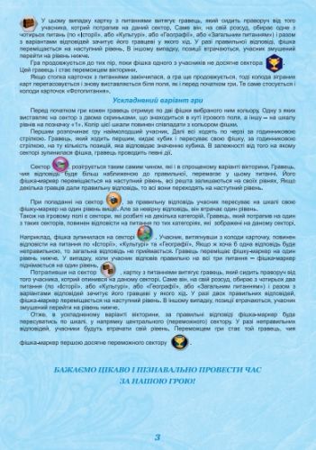 Комплектація: Ігрове поле, 144 картки з питаннями, кубик, фішки (8 шт.)