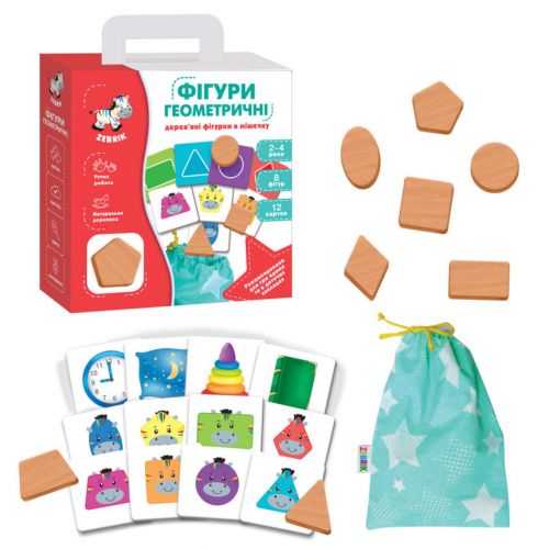 Набір складається з геометричних фігур в різних видах: дерев’яні брусочки, кольорові картки, зебри і предмети. Різні варіанти гри – назви кольору карток, знайди на яку фігуру схожа зебра, підбери до фігури схожий на неї предмет, вибери картку з фігурою і знайди на дотик в мішечку дерев’яний брусок потрібної форми.