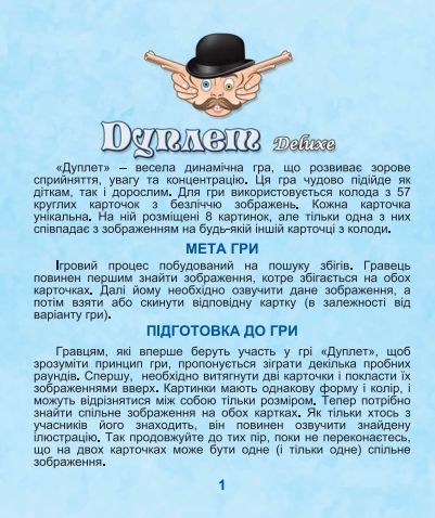 Настільна гра “Дуплет Deluxe”. Ігровий процес побудований на пошуку збігів. Картинки розділені на групи. У кожній групі є одна картинка, що збігається з картинкою на іншій картці з колоди. Мета гри – знайти картку з збігається картинкою, вимовити вголос, що на ній намальовано і забрати собі, як переможний трофей. 57 круглих карток. У металевій баночці.
