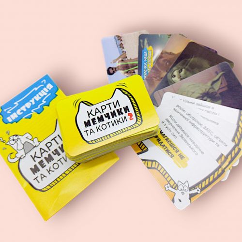 Захоплива та весела гра для всієї родини та друзів. Гравці повинні створити мем, використовуючи картки з різними мемами та висловлюваннями. Збирайте картки та складайте веселі фрази, що розсмішать усіх навколо. Гра має багато варіацій, тому вона не надокучлива або передбачувана. Завдяки цій грі ви отримаєте багато позитивних емоцій та відпочивайте в компанії друзів. Для 3-6 гравців старше 16 років.