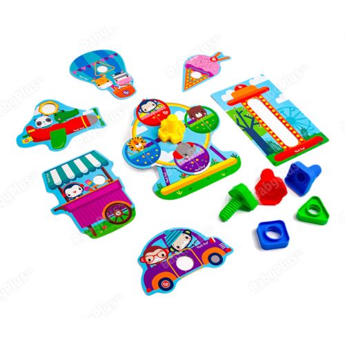 У набір входить 8 картонних деталей, 4 пластикові болтики та 4 гайки. Розкладіть перед дитиною фігурні картонні деталі та пориньте разом у веселу атмосферу парку розваг. Власними рученятами малюк створить каруселі, які можна обертати. Веселі атракціони, які рухаються вгору-взиз та в боки. Для кожної деталі-основи призначено болтик певної форми.