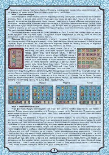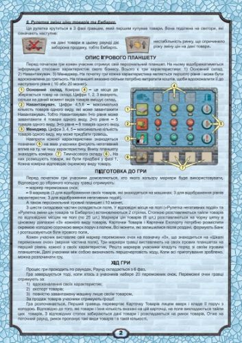 Комплектація: Ігрове поле 4 шт. ігрових планшета 30 карток товарів 12 карток експорту 150 фішок товарів (6 видів) 42 монети чотирьох номіналів 40 шт. маркери 4шт. маркери переможних очок 6шт. маркери цін товарів 2шт. стрілки до ігрового поля