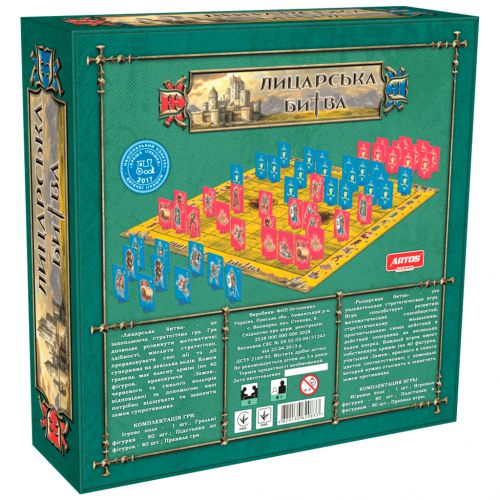 Настільна гра “Лицарська битва”. Стратегічна гра дозволяє розвинути математичні здібності, вчить мислити стратегічно і прораховувати свої дії і дії суперника. Кожен гравець має свою власну армію (по 40 фігур, з огляду на “Замок”, червоного і синього кольорів відповідно).