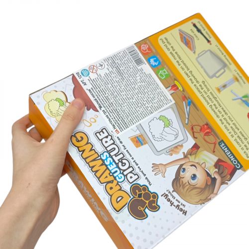 Комплектація: 2 маски-окуляри (червоні та сині), 8 маркерів різних кольорів, 54 картки із завданнями, дошка для малювання, пісочний годинник, еластичні стрічки