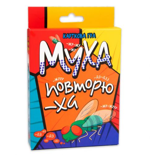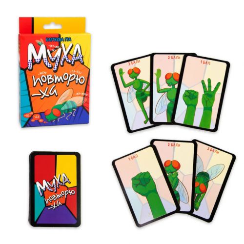 Карткова гра “Муха-повторюха”. Все доволі просто: повторюй рухи, що на картках, заробляй бали та вигравай. Є чотири варіанти гри: якщо граєш сам, якщо у грі 2 чи більши учасника, та два варіанти гри у парі. Для дітей віком від 6 років. Кількість гравців – 1-5. Комплектація: 55 карток, інструкція.