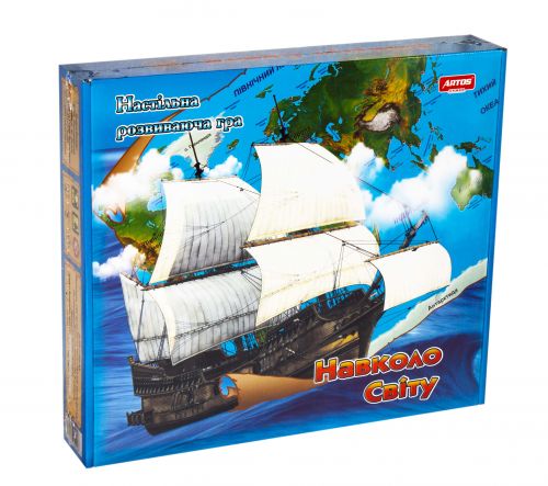 Настільна гра “Навколо світу”. Учасники гри будуть проводити експедиції, при цьому рухаючись у випадковому (вибраному ним) напрямку, розрахувавши оптимальний маршрут. У комплекті: ігрове поле (укр. І рос. Мовою), картки вантажу (по 32 картки на 2-х мовах), картки експедиції (по 4), призові жетони (по 60 шт.), Рулетка вітрів, гральні фішки (4 шт.), кубик, правила гри.