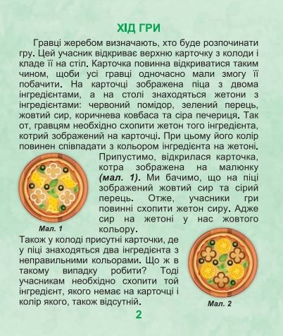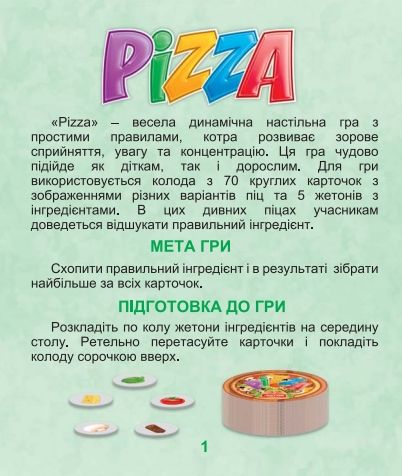 Настільна гра “Піца” – це весела динамічна гра в карти з простими правилами, яка розвиває зорове сприйняття, увагу і концентрацію. Для гри використовується колода з 70 круглих карток із зображеннями різних варіантів піц та 5 жетонів з інгредієнтами. Мета гри: схопити правильний інгредієнт і в результаті зібрати більше всіх карток. У металевій баночці.