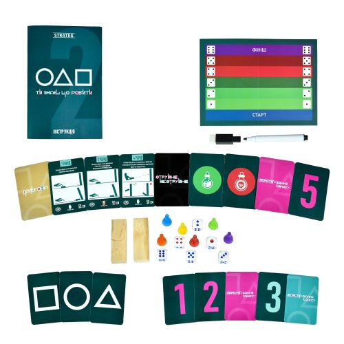 Комплектація: Коробка, ігрове поле, гральні кубики – 6 шт., фішки – 6 шт., дерев’яні бруски – 2 шт., маркер, картки 54 шт., прозора картка, інструкція.