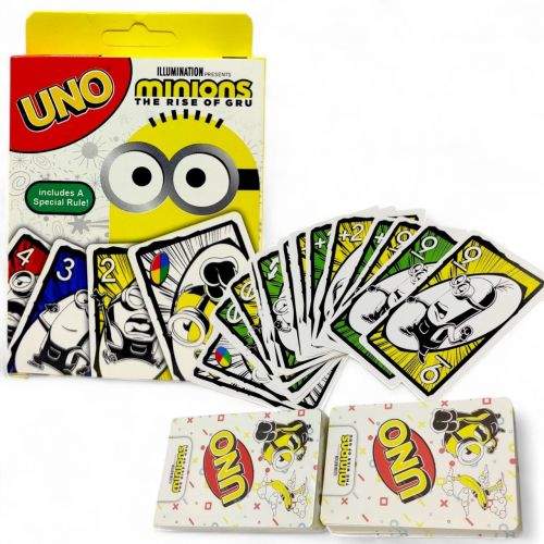 Знайома гра “УНО”, тепер з милими героями “Посіпаки”! Ідеальний подарунок для людини, яка цих героїв обожнює, та весела гра для цілої сімʼї. Змагайтеся, щоб вичерпати всі свої карти, використовуйте карти, щоб уповільнити супротивників, і коли у вас залишиться одна карта, кричіть “УНО”! Від 2 до 10 гравців.