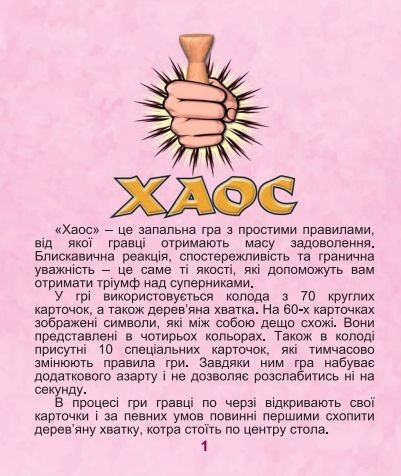 Настільна гра “Хаос” – це запальна карткова гра з простими правилами, яка розвиває реакцію, спостережливість і уважність. У грі використовується колода з 70 круглих карток, а також дерев’яна хватка. На 60 картках зображені символи, які між собою мають невеликі відмінності. Також в колоді присутні 10 спеціальних карток, які тимчасово змінюють правила гри. Завдяки їм гра набуває додаткового азарту і не дозволяє розслабитися ні на секунду. В процесі гри гравці по черзі відкривають свої картки і за певних умов повинні першими схопити дерев’яну хватку, яка стоїть в центрі столу. У металевій баночці.