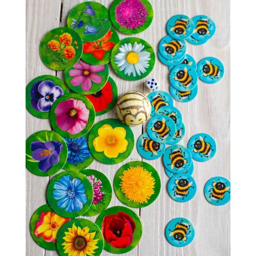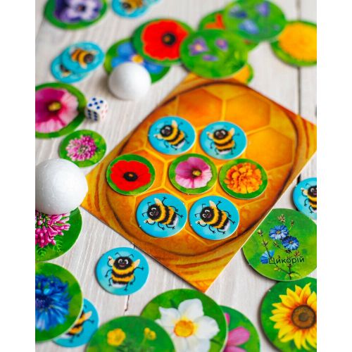 Комплектація: Велику бджілку (для великих пальчиків), маленьку бджілку (для маленьких пальчиків), 20 великих фішок, 20 маленьких фішок, бджолине гніздо, кубик, правила гри