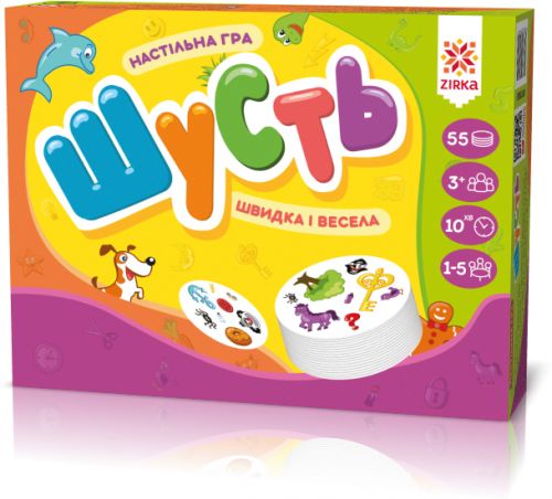 Настільна гра “Шусть” призначена для 1-5 гравців, віком від 5-ти років і займає 10 хвилин. “Шусть” – гра на швидку реакцію, в якій всі учасники грають одночасно. Вона в простій формі розвиває спостережливість, задіє не тільки рухову активність і мислення, а й мова гравців. У комплекті: 55 карток із зображеннями і інструкція. На кожній картці по 8 зображень і тільки одне з них збігається із зображенням на іншій картці. Необхідно знайти два однакових зображення на своїй картці і картці, що лежить на столі.