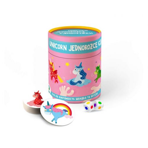 Настільна гра “Єдиноріжки”. У комплекті: 2 кубика з кольоровими гранями, 27 карток. Правила гри: перед початком гри розкладіть на столі фішки. Наймолодший гравець першим кидає кубики. Гравцям потрібно знайти на столі зображення, на якому присутні кольору, які випали на кубиках і зловити його. Переможе той, хто набере найбільше очок.