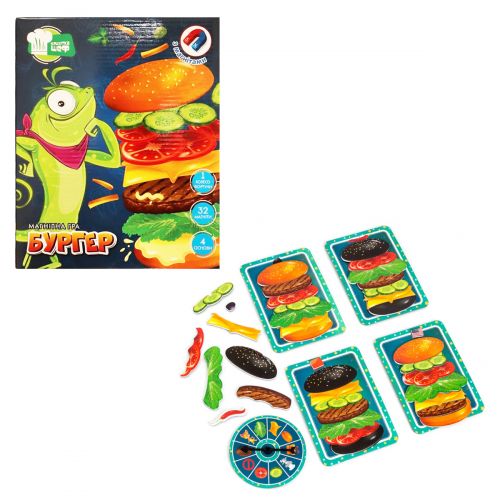 Настільна мгнітную гра “Бургер”. У грі можуть брати участь 2-4 гравця. Кожен гравець, по черзі, крутить колесо фортуни, і виконує дії, які вказані на колесі (вибирає той, чи інший інгредієнт). Переможе той, хто швидше збере бургер. Для дітей від 3-х років.