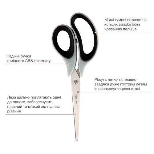 Офісні ножиці з пластиковими ручками – використовуються для різання паперу, картону, тканини та ін. Якісні матеріали та збірка, продумані деталі офісних ножиць Axent забезпечують комфортну, безпечну роботу і довговічність. Леза – з високоякісної сталі, міцні і стійкі до корозії, не потребують додаткового заточування. Кінчики лез закруглені для безпечної роботи. Леза щільно прилягають один до одного, забезпечують плавний і м’який хід. Папір розрізається легко і без зминання. Рукоятки з міцного пластику, стійкі до навантажень. Особливість серії Axent Duoton Soft – м’які гумові вставки на кільцях, які підвищують зручність та комфорт використання, запобігають ковзанню пальців. Ергономічна форма рукоятки повторює анатомічний вигин долоні. Двоколірний дизайн в класичних кольорах Axent.