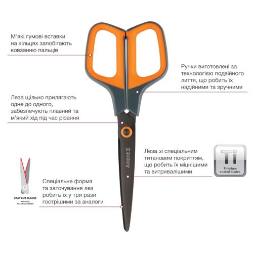 Офісні ножиці з пластиковими ручками ергономічної форми Axent Titanium. Використовуються для різання паперу, картону, тканини та ін. Якісні матеріали та збірка, продумані деталі ножиць забезпечують комфортну, безпечну роботу і довговічність. Особливість ножиць серії Axent Titanium – особлива форма лез, виготовлених з високоякісної сталі та вкриті покриттям Gun Black Titanium, що робить їх ще більш міцнішми, зносостійкими, та прослужать довше. Особлива заточка лез робить їх в три рази гостріше аналогів, а їх кінчики закруглені для безпечної роботи. Леза щільно прилягають один до одного, забезпечують плавний і м’який хід. Папір розрізається легко і без зминання. Ручки виготовлені за технологією подвійного лиття, що робить їх міцними та надійними. Зручність і комфорт у використанні, стильний дизайн. Упаковка – блістер.Офісні ножиці з пластиковими ручками ергономічної форми Axent Titanium Lite. Використовуються для різання паперу, картону, тканини та ін. Якісні матеріали та збірка, продумані деталі ножи