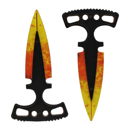 Набір із 2-х тичкових ножів “SO-2”. Матеріал: фанера. Довжина одного ножа – 14 см, ширина ручки – 7 см. Чудовий подарунок-сувенір. Ножі дерев`яні, якісні та міцні. Не заточені, гострі частини закруглені та зашліфовані, повністю безпечні. Для дітей віком від 6 років.