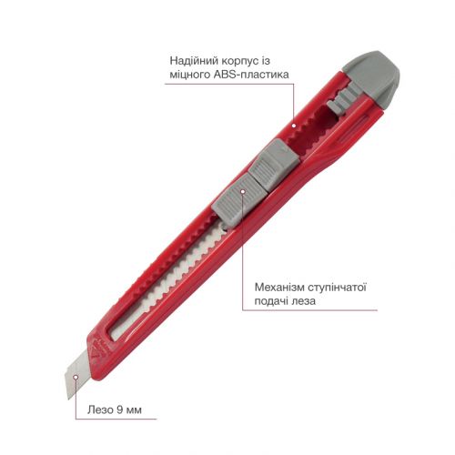 Канцелярський ніж Axent – це надійний, безпечний і довговічний інструмент для використання в офісі або в побуті завдяки поєднанню якості матеріалу і надійності механізму. Сталеве багатосекційне лезо забезпечує найвищу функціональність, стійкість, гостроту. Міцний пластиковий корпус стійкий до навантажень, не розбивається при падінні. Надійний механізм і фіксатор леза забезпечує безпечну роботу, виключає ризик раптового випадіння або провалювання леза. Проста і популярна модель.