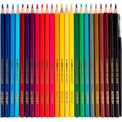 Кольорові акварельні олівці Kite в картонній упаковці з пензликом. Двадцять чотири олівці мають гармонічну палітру, їх компактно зберігати в пеналі і рюкзаку дитини. Акварельні олівці поєднують властивості акварельної фарби і кольорового олівця. По малюнку, виконаному акварельними олівцями, досить провести мокрим пензлем і ми отримаємо справжній акварельний малюнок. Дитячі олівці малюють м’яко, при легкому натисканні дитина легко отримає яскраву картинку. Грифель товщиною в 3 мм малює плавно, не кришиться і не дряпає папір. Олівці при заточуванні або падінні не ламаються і не кришаться. Кольорові олівці виготовлені з міцної натуральної деревини. Олівці покриті лаком в тон кольору грифеля, який запобігає розсиханню і появі тріщин на корпусі. Довжина виробу 175 мм. Набір олівців Kite рекомендований для дошкільнят і школярів.