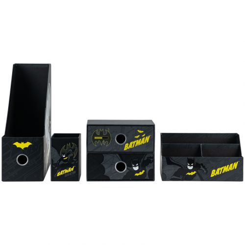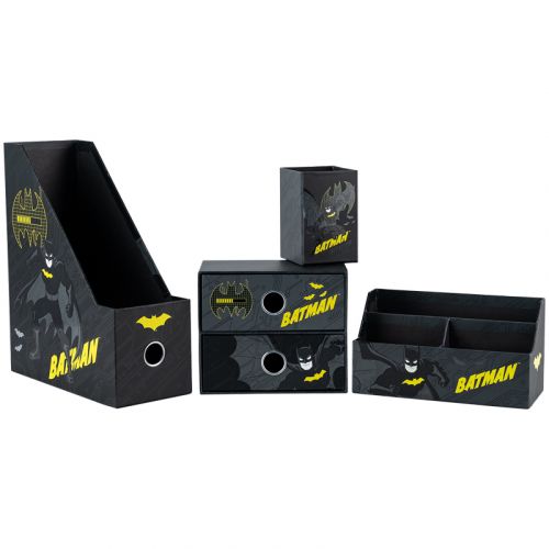 Органайзер настільний (4 предмети) призначений для зберігання канцелярії та дрібниць. Особливості: • лоток для канцелярського приладдя – 10,8*25.5*30 см; • підставка для дрібниць – 21.4*9.5*11.4 см; • стакан для ручок – 8*8*11.5 см; • міні-комод з двома висувними шухлядами для дрібниць – 18*9.8*15 см; • матеріал – ущільнений картон; • яскравий трендовий дизайн DC. • упаковка: пластиковий бокс з ручкою.