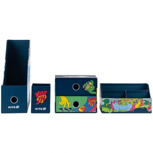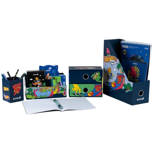Органайзер настільний Kite HW25-357 (4 предмети) призначений для зберігання канцелярії та дрібниць. Особливості: • лоток для канцелярського приладдя – 10,8*25.5*30 см; • підставка для дрібниць – 21.4*9.5*11.4 см; • стакан для ручок – 8*8*11.5 см; • міні-комод з двома висувними шухлядами для дрібниць – 18*9.8*15 см; • матеріал – ущільнений картон; • яскравий трендовий дизайн Hot Wheels. • упаковка: пластиковий бокс з ручкою.