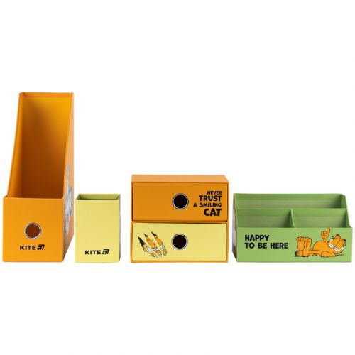 Органайзер настільний Kite GF25-357 (4 предмети) призначений для зберігання канцелярії та дрібниць. Особливості: • лоток для канцелярського приладдя – 10,8*25.5*30 см; • підставка для дрібниць – 21.4*9.5*11.4 см; • стакан для ручок – 8*8*11.5 см; • міні-комод з двома висувними шухлядами для дрібниць – 18*9.8*15 см; • матеріал – ущільнений картон; • яскравий трендовий дизайн Garfield • упаковка: пластиковий бокс з ручкою.