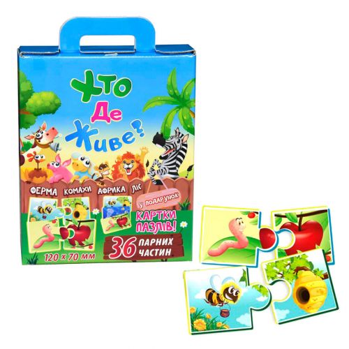 Пазли дитячі “Хто де живе?” познайомлять малюка з мешканцями ферми і ліси, тваринами Африки і комахами. Дитині потрібно буде до пазлу на якому зображені тварини, підібрати їх будиночок. Картки в подарунок.