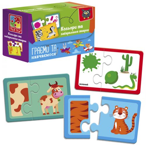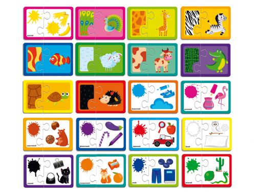 Міні-пазли для малюків, які чудово сприяють розвитку уяви, дрібної моторики рук та логічного мислення. У комплекті є 21 пазл, кожен складається із двох елементів. З їх допомогою малюк зможе вивчити тварин та їх забарвлення, а також ознайомиться з усіма кольорами веселки. Розмір одного пазла: 6х9 см.