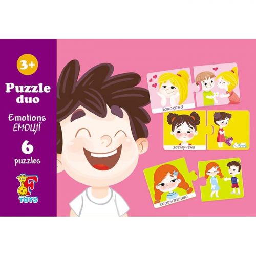 Яскраві та барвисті пазли на 6 елементів. Великі деталі. Розвивають логічне мислення, дрібну моторику рук, посидючість. У наборі пазли з емоціями та відповідними їм картинками. Підходить для дітей віком від 3-х років.