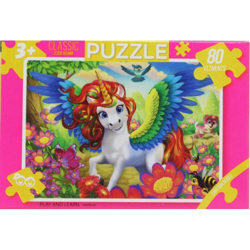 Яскраві барвисті пазли на 80 елементів, з зображенням казкових персонажів. Розмір готової картинки: 23 х 16,5 см.