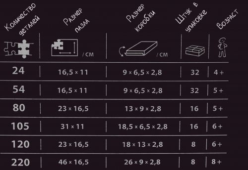 Розмір готової картини: 16.5 * 23 см. Кількість деталей 120 деталей. 8 пазлів в наборі.